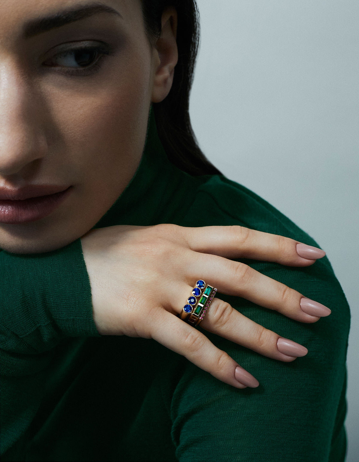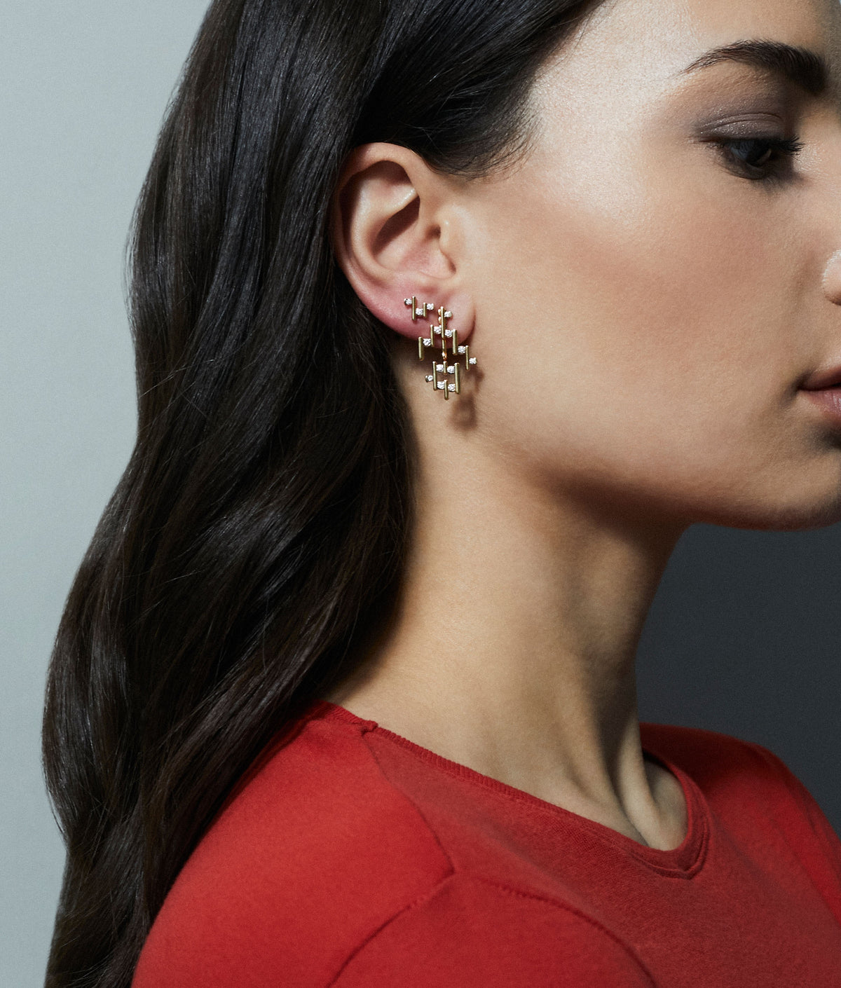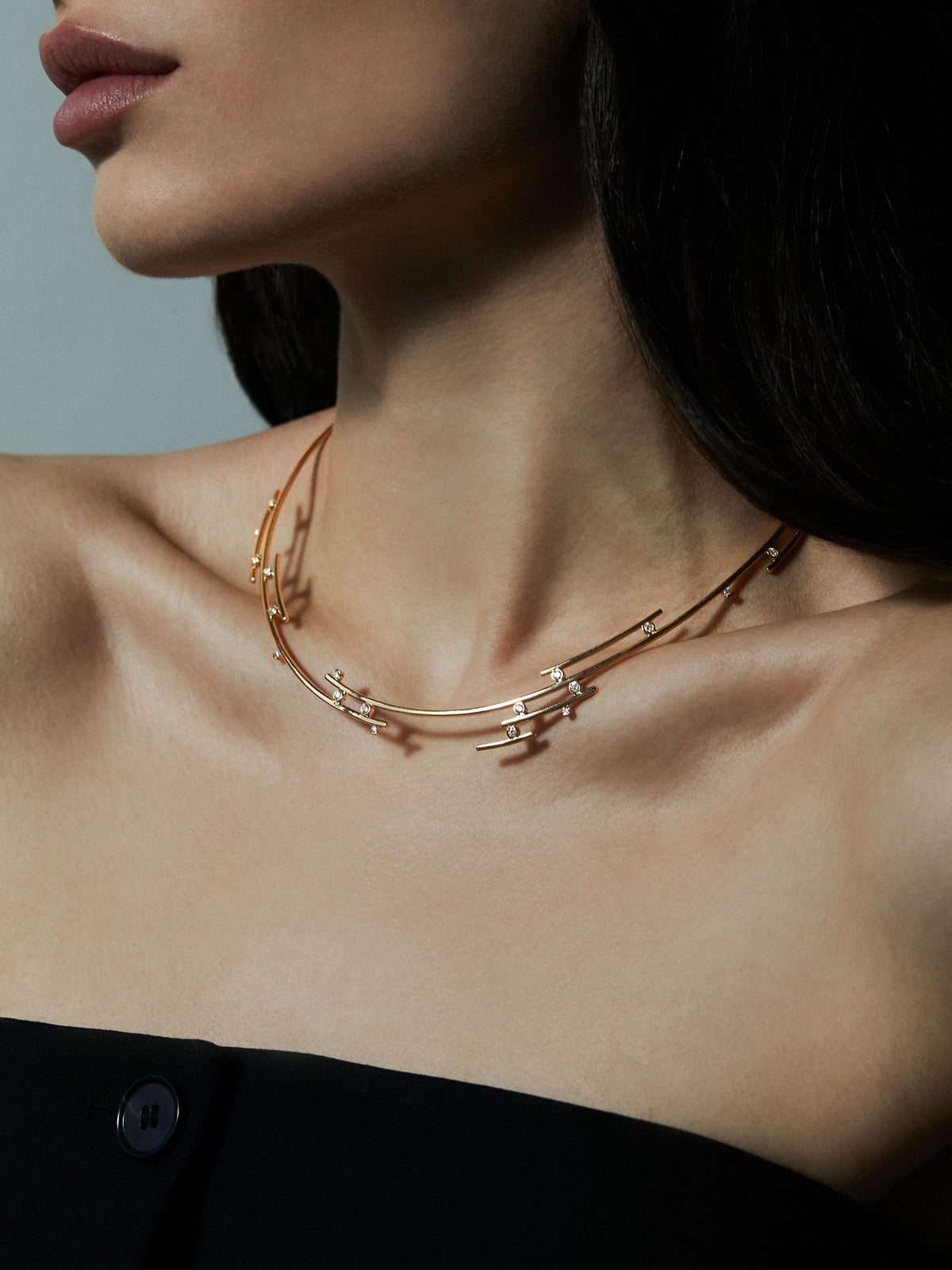 Inspired by the natural beauty of Iceland's waterfalls, the Cascade collection features bright pieces with straight lines, dotted with round white diamonds
