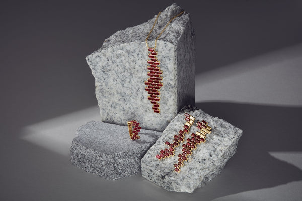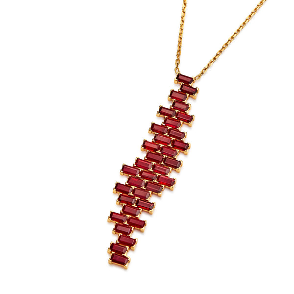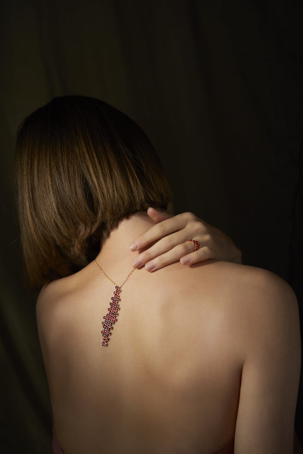 The dancing rubies of the Red Bricks pendant undulate and climb up the collar, as an intricate mechanism at each fourth level creates an illusion of flowing movement.