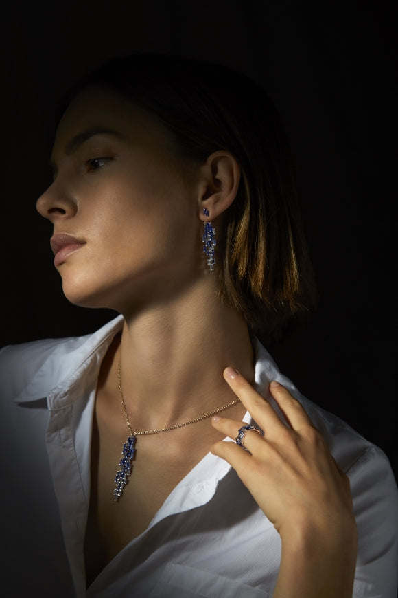 Melding together stunning sapphires in infinite blue hues, and frosty diamonds with serene streams of platinum, this collection evokes the raw forces of nature's beauty