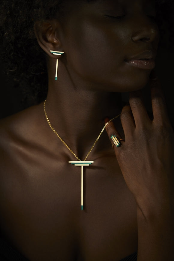 Inspired by outer space exploration, these pieces evoke the wonder, possibility and mystery of the great expanse, featuring geometric lines that contrast brilliant gold shapes