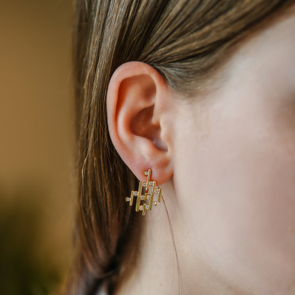 An elegantly stylised interpretation of the waterfalls of Iceland. Linear gold assembled into architectural forms expresses the power of the torrent, as white diamond spray scatters the light.