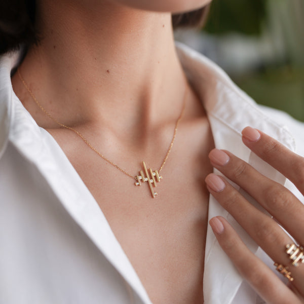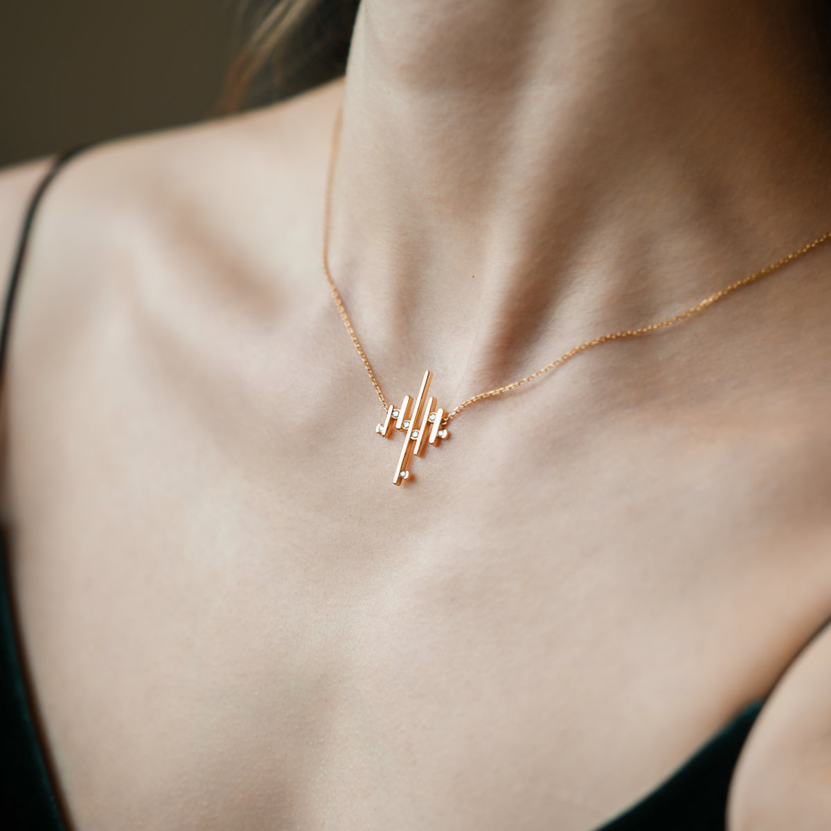 An elegantly stylised interpretation of the waterfalls of Iceland. Linear gold assembled into architectural forms expresses the power of the torrent, as white diamond spray scatters the light.